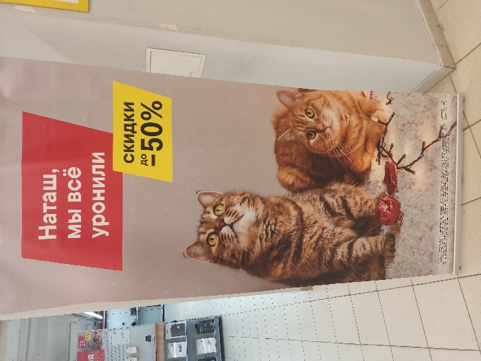 A banner featuring two cats, one ginger and the other tabby, lying on a fluffy white surface with scattered red ornaments. Text in Russian reads "Наташ, мы всё уронили" (Natasha, we dropped everything), accompanied by a yellow sign stating "скидки до -50%" (discounts up to -50%). The banner is partially mounted in what appears to be a retail or commercial setting, with shelving and possibly product displays visible in the background.