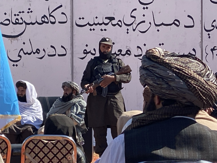 An outdoor scene in Mandisar, Afghanistan, depicts a public gathering