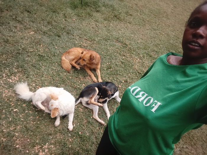 The scene is set outdoors in Mahiakalo ward, Kenya. An adult female with dark skin and dark hair is partially visible on the right, her upper torso and face captured as if in a selfie. She wears a short-sleeved green t-shirt with inverted white text, and her mouth is slightly open. Three medium-sized dogs occupy the grassy ground. In the upper-mid section, a light brown dog is lying down, curled. In the lower-left, a white dog with tan markings on its ears and tail is lying on its left side, actively scratching its neck area with its right hind leg. A black and white dog is positioned in the lower-mid section, also lying down and appearing to scratch its side with a hind leg. The ground is covered in sparse green grass interspersed with patches of bare earth or debris.