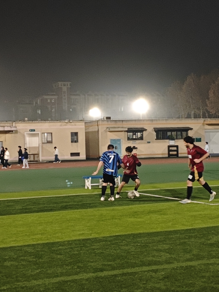 The image displays an artificial turf soccer field at night or under heavy atmospheric haze, located in Unknown, Unknown. Three male individuals, appearing to be in their late teens or early twenties, are actively playing soccer in the foreground. One player, positioned center-left, wears a blue and black striped jersey with the number "7" and the name "MAJID" on the back, black shorts, and white athletic shoes; he stands facing right, arms slightly open. Another player, center-right, wears a maroon jersey, black shorts, and dark athletic shoes, actively dribbling a white soccer ball with his right foot while facing left. A third player, partially visible on the far right, wears a maroon and yellow jersey, black shorts, and light-colored athletic shoes, moving towards the right. A light blue and white slatted bench is positioned on the track behind the players. In the mid-ground, a beige-colored, single-story building with multiple windows and doors runs along the field's edge. Several indistinct figures are visible walking on a track behind the field boundary on the left side of the image. The background features taller, multi-story buildings, one with a distinctive tiered top, partially obscured by atmospheric haze and illuminated by multiple bright, round floodlights. Bare-branched trees are present on the right side of the background. The sky is dark and hazy.