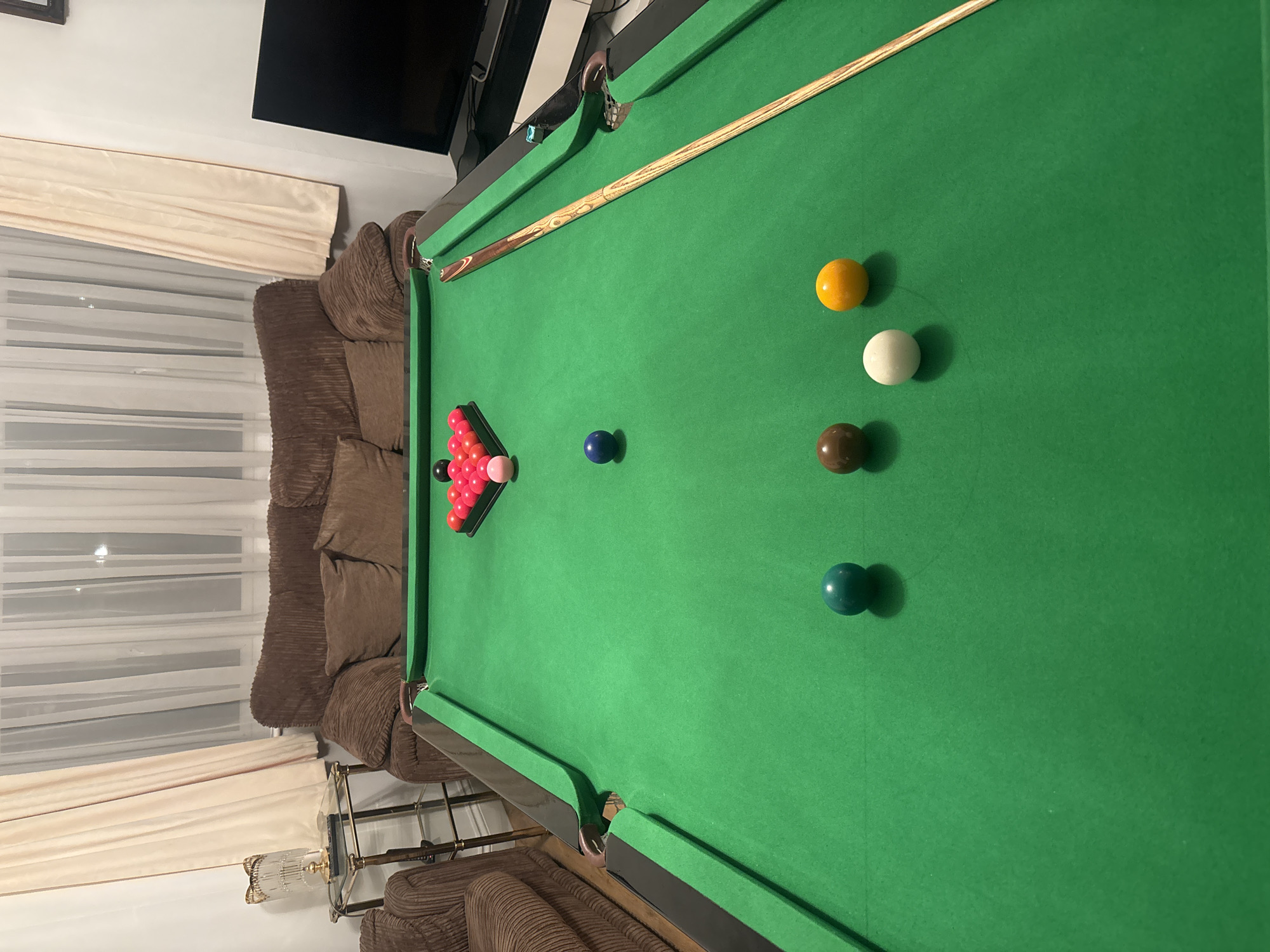 The image displays an indoor domestic setting, likely a living room or recreation area, featuring a green-felted snooker table as the central subject