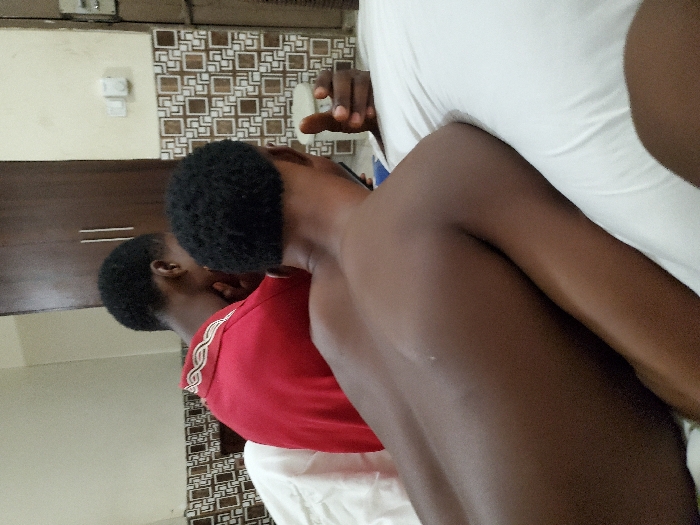Two young men are close together in an indoor setting. One wears a red shirt with a white and gold pattern near the collar. The other is shirtless, revealing his bare back. Both have short, dark hair. A white pillow or cushion is visible beneath them. A textured wall and a light-colored cabinet are in the background. The overall lighting is soft.