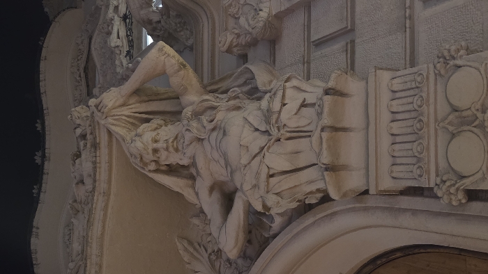 A weathered stone sculpture depicts a muscular figure draped with fabric, positioned horizontally. The figure is intricately carved, with detailed hair and facial features. To the right, a section of ornate architectural molding is visible, featuring rows of circular designs. The background is a mix of light and dark tones, suggesting an indoor setting with varied lighting conditions. The overall composition showcases a classical architectural element.