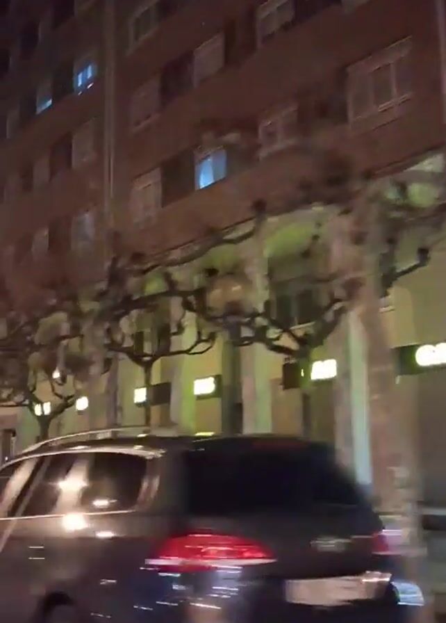 nighttime scene from a moving car in an urban environment. A tall, brown brick building with many windows dominates the background. Trees with bare branches line the street, with streetlights casting a warm glow. Several cars are visible, including a white sedan, a white SUV, and a silver hatchback, all traveling in the same direction. The overall atmosphere is typical of a city street at night.