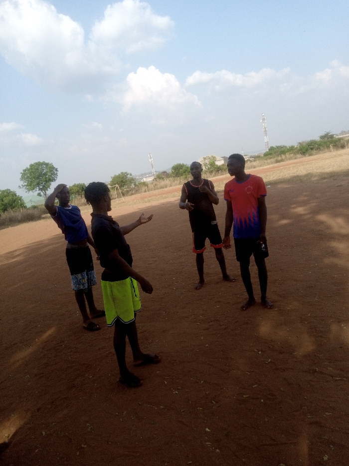 Four young men stand on a dry, dusty field under a partly cloudy sky. Three wear shorts, one black, one blue, and one bright lime green. The fourth wears longer black pants and a red and blue tie-dye shirt. All are barefoot or wearing sandals. In the background, sparse vegetation and some distant structures can be seen. One man gestures with his hand, while another touches his head. The general scene suggests a casual gathering outdoors.