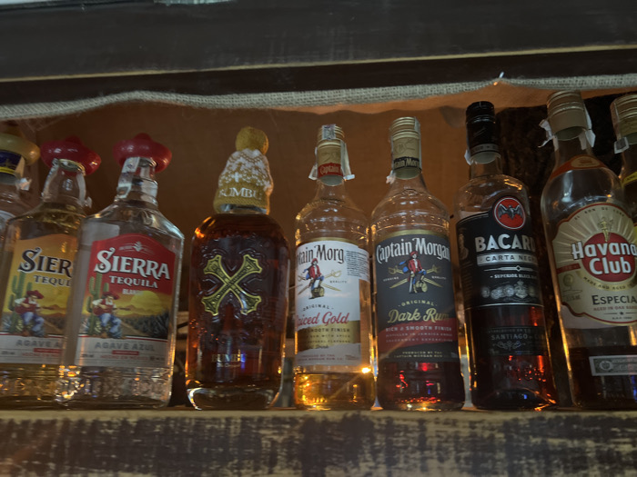 The image displays a close-up, eye-level view of a wooden shelf stocked with assorted liquor bottles, consistent with a commercial establishment such as a bar or retail store located in Sofia, Bulgaria. The exact street address or name of the establishment cannot be determined from the visual evidence. The shelf is constructed from dark, possibly distressed or aged, wood. Behind the bottles, a light-colored, coarse woven fabric, resembling burlap or hessian, is visible on the back panel of the shelf above. Ambient lighting illuminates the scene, causing reflections on the glass surfaces of the bottles. From left to right, the visible subjects are: 1. A partial view of an unidentified bottle topped with a yellow cap. 2. A Sierra Tequila Blanco bottle, distinguishable by its clear liquid and a red sombrero-shaped cap. The label features a cowboy on a desert landscape. 3. Another Sierra Tequila Blanco bottle, identical to the preceding one, also with a red sombrero-shaped cap. 4. A distinctively shaped dark amber liquid bottle, featuring a prominent gold 'X' emblem on its label and a textured, yellow, knit cap-like closure. Partial text 'RUMBA' is visible on the cap. 5. A Captain Morgan Original Spiced Gold Rum bottle, containing amber liquid. 6. A Captain Morgan Original Dark Rum bottle, containing darker amber liquid. 7. A Bacardi Carta Negra (Black) Rum bottle, featuring a dark label and containing dark amber liquid. 8. A Havana Club Añejo Especial Rum bottle, containing light amber liquid, with a gold and red label. 9. A partial view of an unidentified bottle on the far right. No people are present in the image, and no actions or interactions are depicted. The scene is static, portraying only inanimate objects.