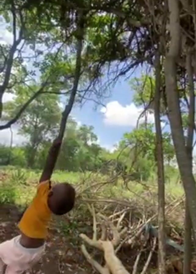 A young Black child, wearing a mustard-colored shirt and light-colored pants, hangs from a tree branch in a wooded area