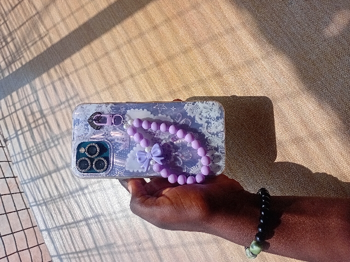 A dark-skinned left hand holds a smartphone vertically, encased in a translucent purple protective cover adorned with white snowflake and lace patterns. The phone case features individual silver-colored rings around the three camera lenses. A purple beaded wrist strap, featuring a purple bow-shaped charm with a white pearl accent, is attached to the upper right corner of the phone case via a heart-shaped clip. The wrist of the hand bears two beaded bracelets: one with a mix of dark and lighter green/gray beads, and another composed entirely of black beads. The subject is positioned outdoors, under strong direct sunlight, which casts sharp, intersecting grid-like shadows from an overhead structure onto a light-colored, textured ground surface. The precise location within Lagos, Nigeria, cannot be determined from the visual evidence.