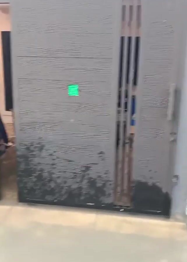 The video depicts a flooded area with two children wading through the water. One child, dressed in a light green outfit, opens a gray gate with vertical bars and appears to be entering or exiting the property. An adult can be seen through the gate’s opening. The other child, wearing a blue shirt and shorts, is standing near a white wall with a decorative lattice-like pattern, seemingly touching or interacting with the wall. The water level is high enough to cover the lower portion of the gate and the base of the wall. Debris and trash are floating in the water. A white bucket with the number 6 printed on it is visible near the wall. The setting is likely a residential area affected by flooding.