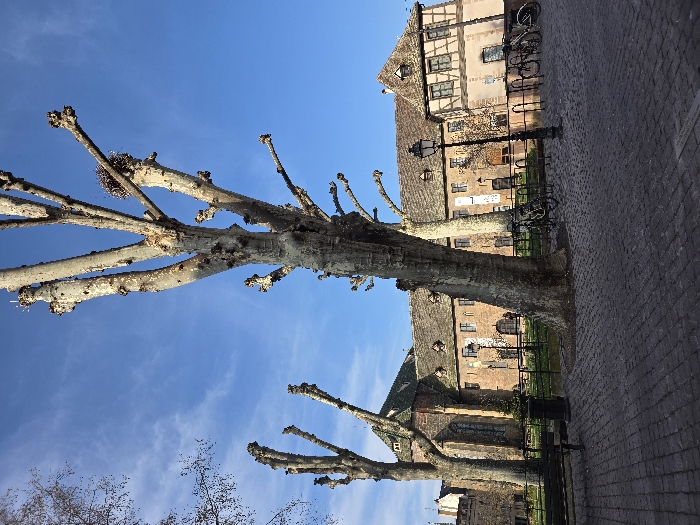 The image displays an outdoor urban scene in Strasbourg, France, under a clear blue sky with sparse white clouds. The foreground consists of a dark grey cobblestone plaza. On the left, a black slatted park bench is positioned next to a black cylindrical trash receptacle. Directly in front of the background buildings, a low dark metal railing separates the paved area from a narrow strip of green grass. Three prominent, bare deciduous trees, severely pollarded with thick trunks and cut-back branches, dominate the scene. The largest tree stands centrally, its upper branches containing a visible bird's nest. A smaller, similarly pollarded tree is to its left, and another is partially visible on the far left. Bare branches of an additional tree are in the upper-left corner. In the midground, a black ornamental street lamp with a lantern top stands between the central tree and the building on the right. Several dark-colored bicycles are parked, leaning against the metal railing or dedicated bike racks, with at least one bicycle clearly visible on the right side of the central tree and others further to the right behind the street lamp. The background features historic European architecture. On the left, a large, multi-story stone building with reddish-brown masonry, arched windows (some with gothic tracery), and a complex, steeply pitched dark green/brown tiled roof with dormers is visible. This structure appears to be a significant public or institutional building. Adjacent to it on the right, and behind the central tree, is another stone building with multiple rectangular windows. To the far right, a distinctive half-timbered building with light-colored infill panels and dark wooden beams features multiple windows and a steeply pitched tiled roof. No individuals are clearly discernible or engaged in specific actions, with only a very small, indistinct figure appearing in the far distance near the central background building. The environment suggests a public square or plaza during daylight, likely in winter or early spring due to the trees lacking foliage.