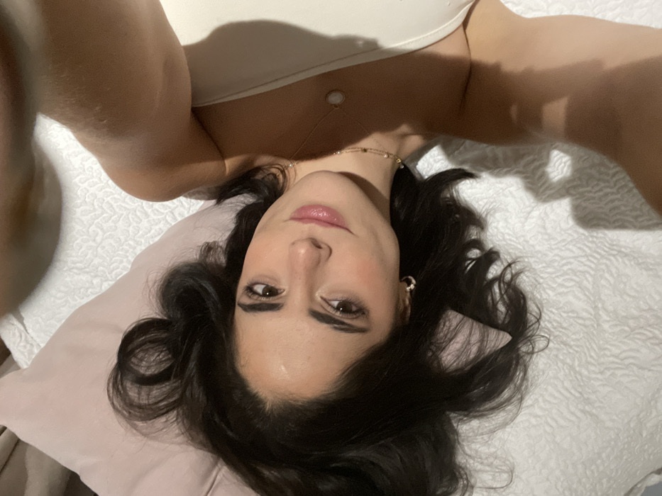 A woman lies on a bed with a textured white sheet, head resting on a light pink pillow. She faces the camera with a slight smile, wearing a light-colored top and a delicate gold necklace. Her dark hair is wavy around her face. She has fair skin, dark eyebrows, and noticeable makeup on her lips and eyes. An earring is visible in her left ear. The camera angle is directly above, creating an intimate, close-up perspective.