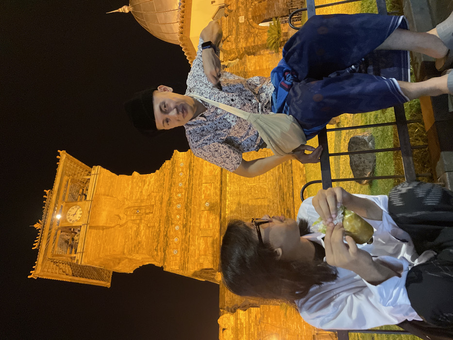 A nighttime wide shot depicts two males in the foreground against the illuminated Great Mosque of Kauman in Kauman, Indonesia. The mosque's prominent square clock tower, lit in a warm orange hue, dominates the left background, featuring a white-faced clock near its top. A golden dome of the mosque is partially visible to the right of the tower. In the midground, a black metal fence separates the subjects from the mosque grounds, with green grass visible behind it. The male on the right, wearing a black peci, a light-colored short-sleeved patterned shirt, a dark blue sarong with red circular patterns, and light grey slip-on sandals, is seated on the black fence. A light beige sling bag is worn across his chest, and a black smartwatch is on his left wrist. He looks towards the camera with a neutral expression. The male on the left, with long dark hair and dark-rimmed glasses, wears a white long-sleeved shirt and dark pants/sarong. He is positioned lower than the first male, holding a small, wrapped food item in both hands, and looking towards the male on the right.
