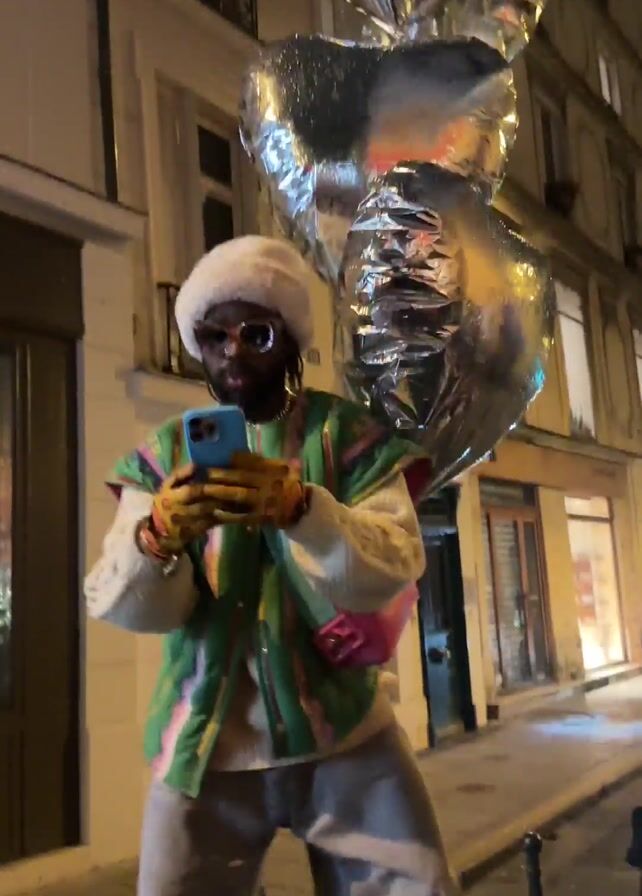 A person wearing a fur hat, glasses, a white sweater, a green and striped vest, grey pants, and pink gloves, carrying several large silver balloons, stands on a bike and uses a smartphone to record a crowd of people outside a restaurant called "Le Progrès." The video is shot at night on a city street. The camera moves, showing the restaurant facade with a red awning and the crowd gathering outside. The crowd consists of diverse individuals, most wearing dark coats and casual attire. Some are looking at the camera, while others are talking and mingling. The street is dimly lit, and building facades are visible in the background.
