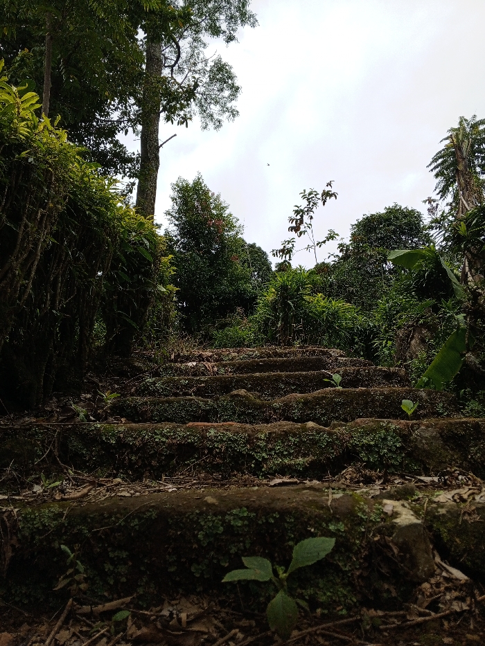 - "The image displays a low-angle, upward perspective of a disused set of approximately ten stone or concrete steps ascending into a densely overgrown, tropical environment" by FM-LiKrb2, licensed under CC BY 4.0