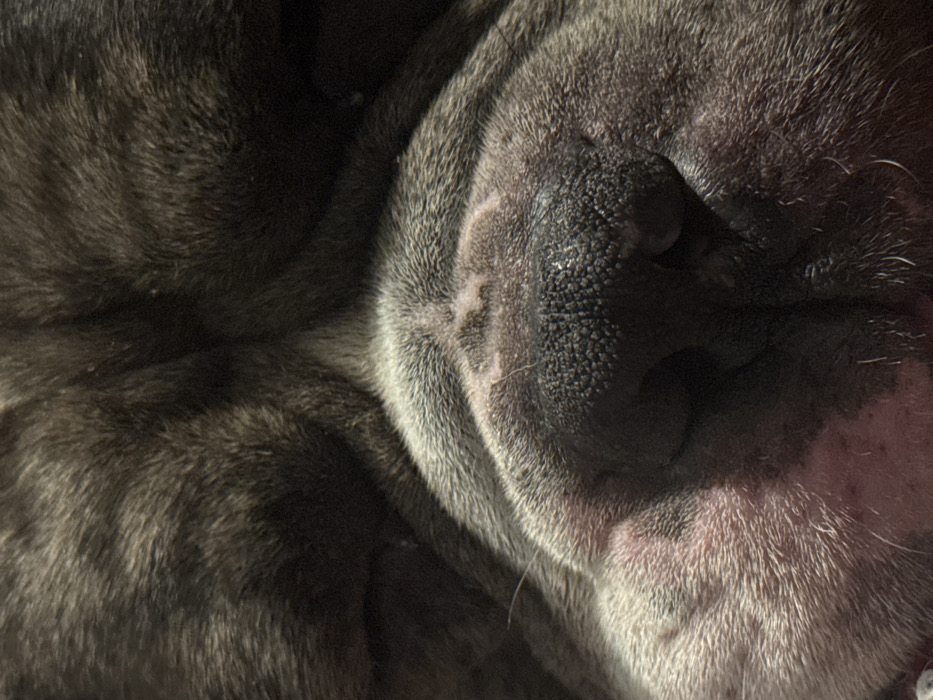- "This image is a close-up, top-down view of a canine's muzzle and forehead, likely a brachycephalic breed such as a bulldog or American Bully, presenting a dark grey to blue-grey short-haired coat" by FM-JZI062, licensed under CC BY 4.0