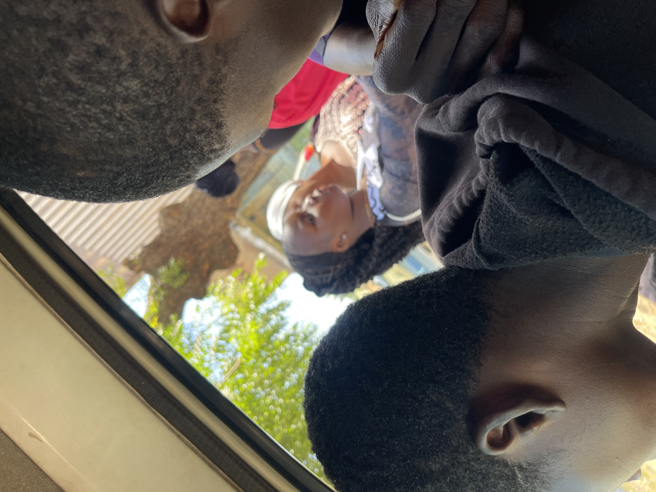 The image depicts a scene observed from inside a vehicle in Muchiya, Nigeria, on a brightly lit day. In the immediate foreground, the backs of two individuals' heads with short, dark hair are visible, suggesting they are seated within the vehicle. The individual on the left shows a partial view of their left ear. The individual on the right has their right hand partially visible, clutching dark fabric. Beyond the vehicle's interior, a female individual is present in the midground, slightly out of focus. She has dark, braided hair, an ear stud, and wears a light-colored head covering and a patterned top. Her gaze appears directed forward or slightly to the right. A partially obscured figure in a red garment is visible behind her. The background shows blurred green foliage from trees and a corrugated metal structure under a bright sky.