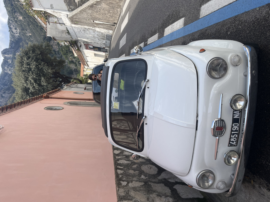 The scene depicts a narrow street in Arienzo, Italy. A white, classic Fiat 500 with a black retractable soft-top roof is parked on the left side of the paved road, facing slightly towards the viewer. Its front features a chrome bumper, two main headlights, two lower auxiliary lights, and an Italian license plate displaying "485190 NA". Behind the Fiat 500, a dark-colored vehicle is parked. A person, identified as a female with dark hair and sunglasses, is visible from the chest up through an opening in the dark vehicle's roof, looking down at a mobile phone held in both hands. To the left, a light pink building with several small arched window-like features borders the street above a stone retaining wall. On the right, the paved road features white dashed lines for a pedestrian crossing and a continuous blue line along the curb. Further down the street on the right, white buildings with a terraced, stair-like structure ascend the hillside. In the background, a large green tree is prominent, backed by a rugged, steep mountain range with visible rock faces and sparse vegetation, under a partly cloudy sky.