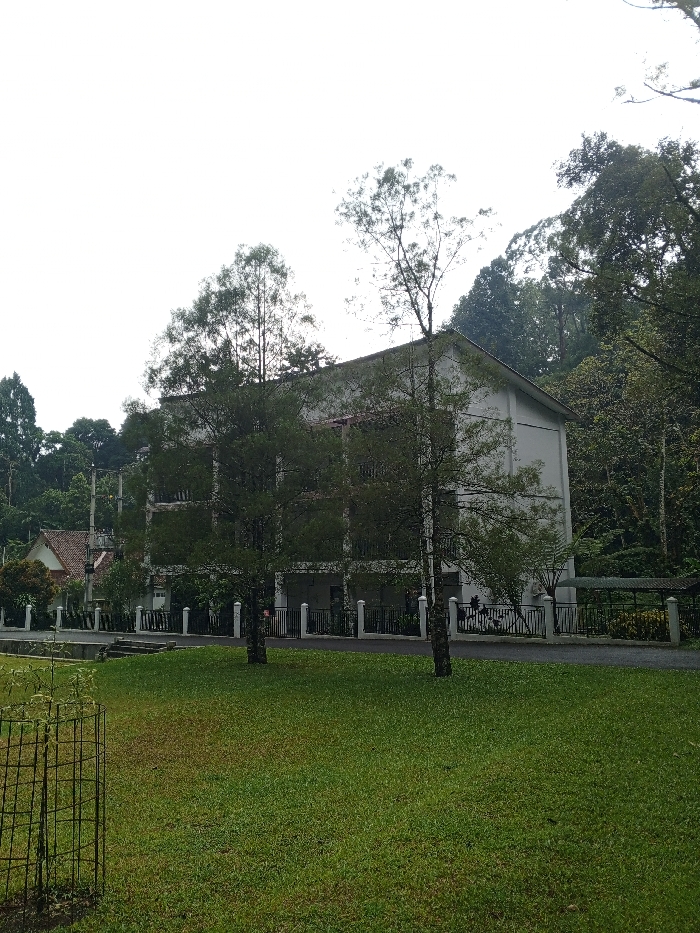 A three-story white building stands behind a black metal fence, partially obscured by two slender trees on a grassy lawn. To the left, a smaller house with a red-tiled roof is visible. A narrow paved road runs parallel to the fence. Dense foliage fills the background, with tall trees surrounding the clearing. The sky is overcast. A small, caged plant is visible in the foreground.