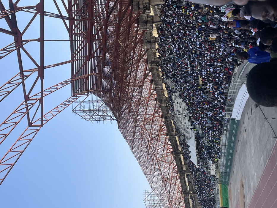 This image depicts an outdoor stadium in Nigeria, identified as "New Stadium," during daylight hours under a clear blue sky. The scene focuses on a densely populated section of the stadium's tiered concrete seating, where thousands of individuals, primarily dark-skinned, are present. Spectators are largely seated or standing, observing an unseen event. Two white temporary canopy tents are visible among the crowd on a lower seating tier. Above the seating, a large red metal truss structure, comprising the skeletal framework of a stadium roof or canopy, spans across the upper portion of the image. Portions of this structure are bare, while others are supported by scaffolding made of metal poles, suggesting ongoing construction or maintenance activities. Below the seating area, a green perimeter fence separates the stands from a reddish athletic track and a green long jump pit area, both partially visible in the lower-left. In the immediate foreground, several spectators are partially visible, including one individual wearing a blue polo shirt.
