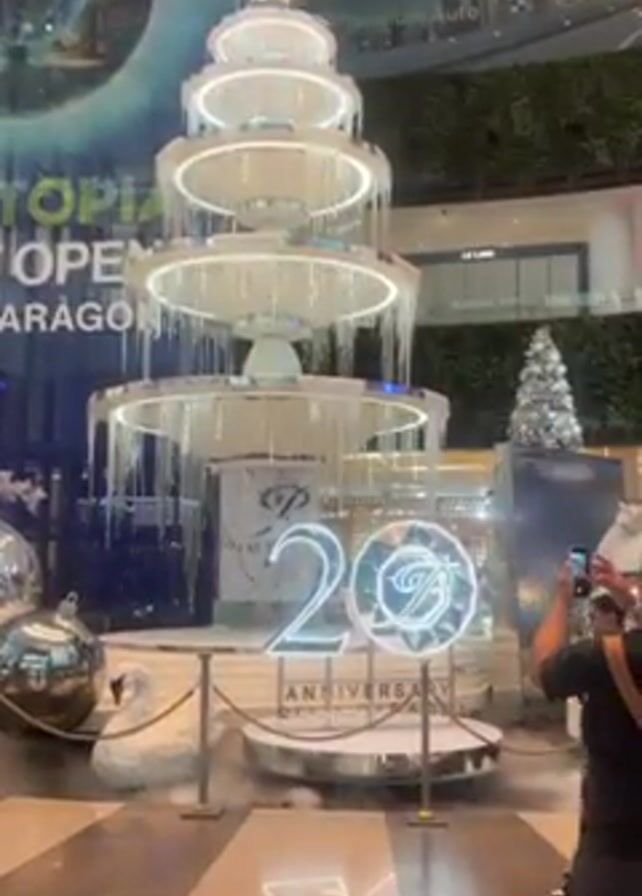 multi-tiered fountain display with white lights and simulated icicles in a mall or large indoor space. It is surrounded by a low rope barrier. The fountain has a “20th Anniversary” logo in front. To the left, there is a silver Christmas tree, large silver ornaments, and a swan decoration. A sign is visible in the background that says, "NEXTOPIA NOW OPEN SIAM PARAGON." Several people are taking pictures of the display with their smartphones. The floor is a polished brown tile and there is a light fog effect around the base of the fountain. The environment is brightly lit.