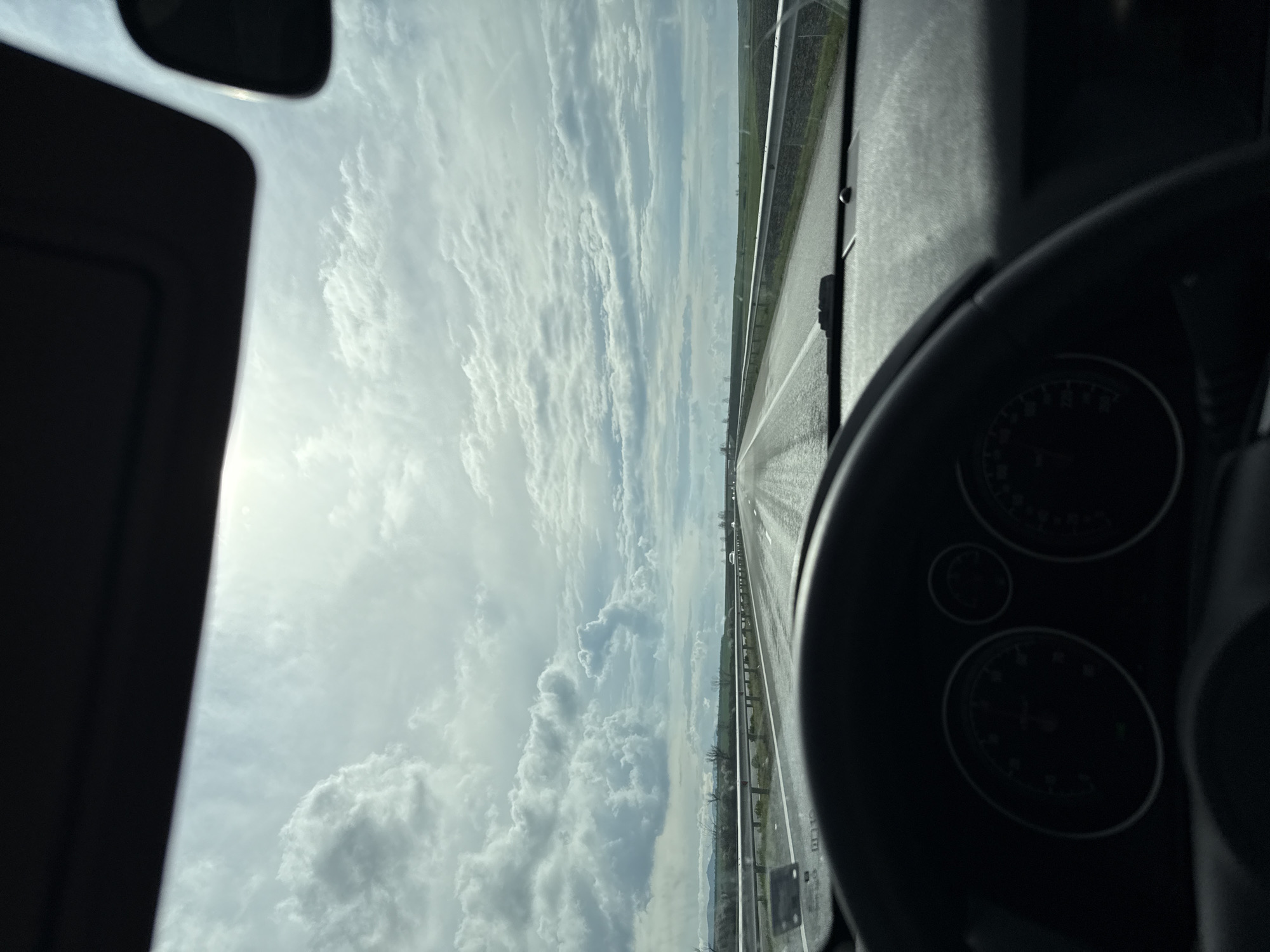 view from inside a car, likely on a highway, with the dashboard and steering wheel visible