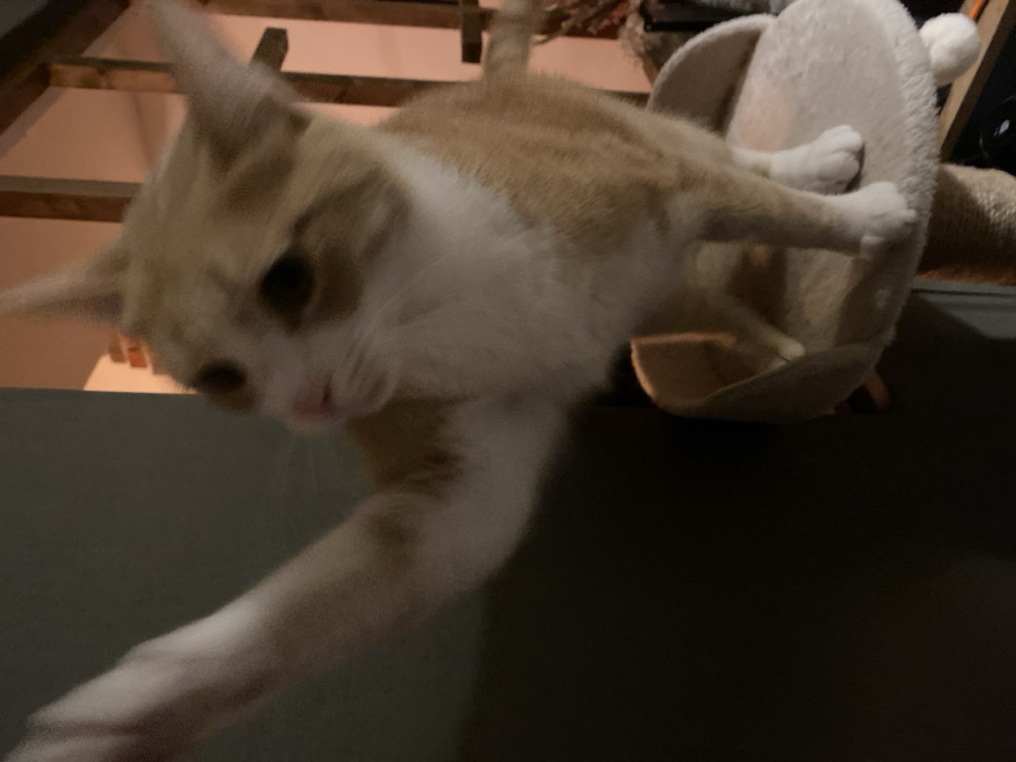 An orange and white cat stretches a paw toward the viewer. The cat is on a cat tree, with a soft, round platform in the background. The cat looks down with slightly blurred features. The paw appears close to the viewer, and the cat tree and background elements are further away. The lighting is dim.