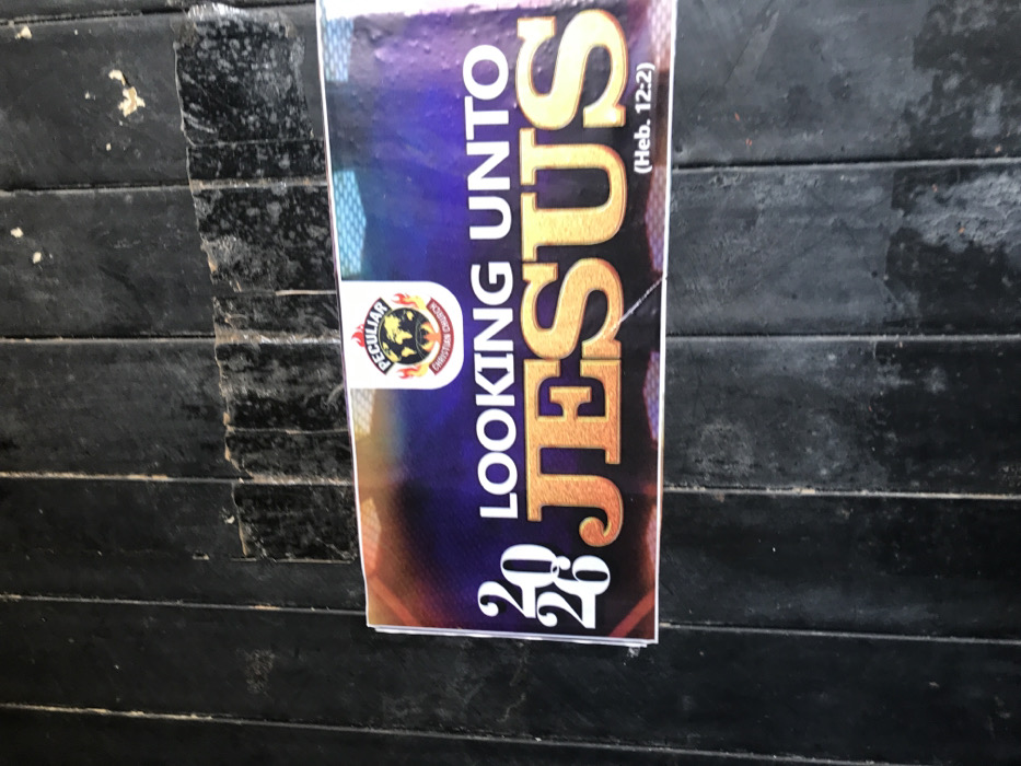 The image displays a rectangular, horizontally oriented banner affixed to a dark, vertically paneled surface. The banner features a gradient background transitioning from purple on the left to blue on the right. In the upper center, a circular logo for "PECULIAR CHRISTIAN CHURCH" is visible, depicting a globe surrounded by flames. White capital letters read "LOOKING UNTO" above the prominent, gold-colored, capitalized word "JESUS," which occupies the central lower portion of the banner. To the far left, partially obscured, are the white numerals "2026" stacked vertically. In the bottom right corner, smaller white text states "(Heb. 12:2)." The dark background surface, likely wood or metal, exhibits vertical lines and appears worn, with visible scuffs and areas of paint or material degradation, particularly along the top edge of the banner. No individuals are present. The precise location within Jos, Nigeria, is not discernible from the visual information provided in the image.