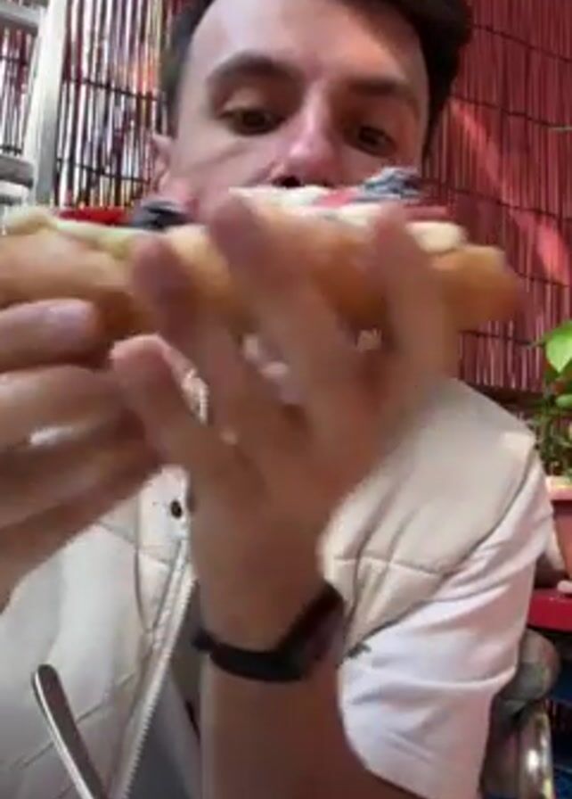 A man in a cream-colored vest is holding a croissant topped with cream, strawberries, and blackberries. He is displaying the pastry, tilting it to show the cream dripping off. In the background, there's a bamboo screen, a ladder, and a plant. A cup and spoon are visible in the lower left corner of the frame.