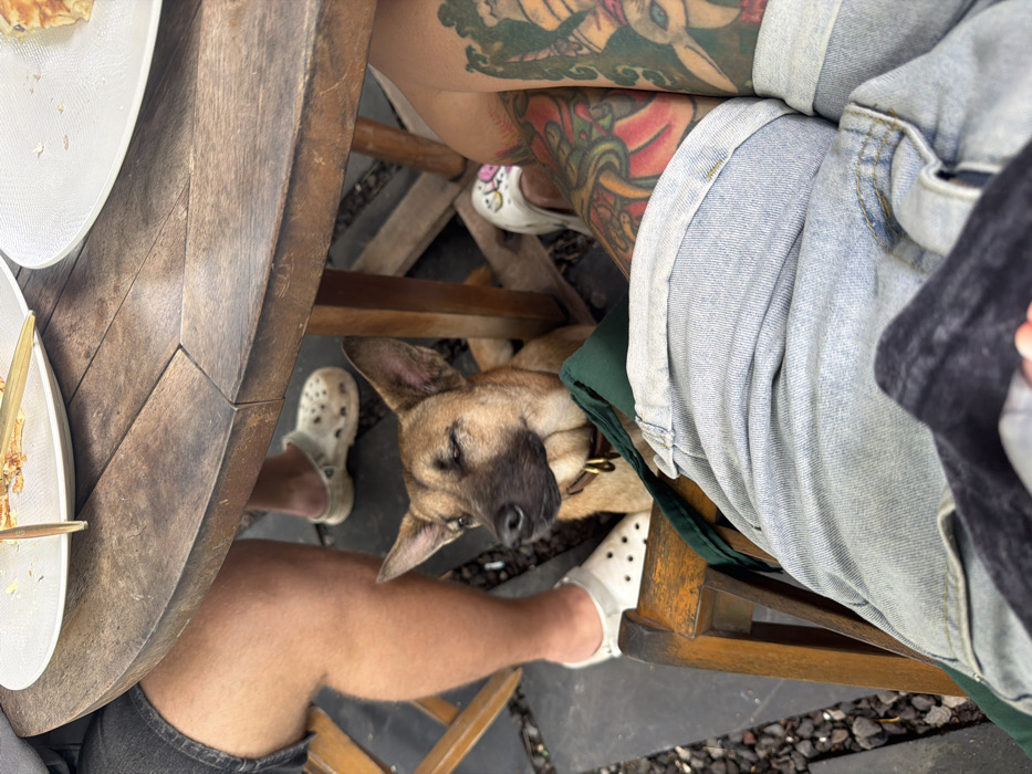 A tan dog with a brown collar lies under a wooden table, positioned between the legs of people wearing Crocs and denim shorts. The person on the left wears light-colored Crocs, while the person on the right wears white ones. Tattoos are visible on the right person's thighs. Plates of food sit on the table's edge, with forks visible near one plate. The scene is captured from an overhead perspective, showing the dog nestled amongst the chairs.