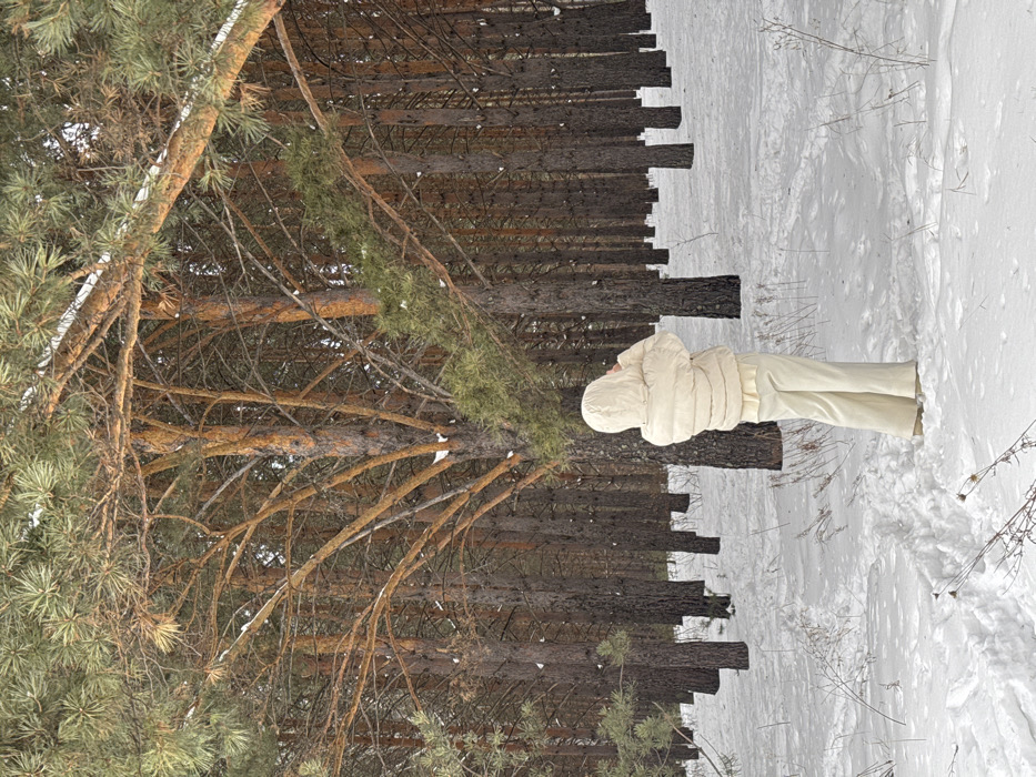 A woman stands in a snow-covered forest of tall, slender trees. She wears a cream-colored, hooded puffer jacket and matching pants. The ground is blanketed in white snow, marked with tracks. The trees are evenly spaced, forming a linear pattern. A large tree with thick branches and green needles dominates the foreground. The perspective of the image makes the trees appear exceptionally tall.