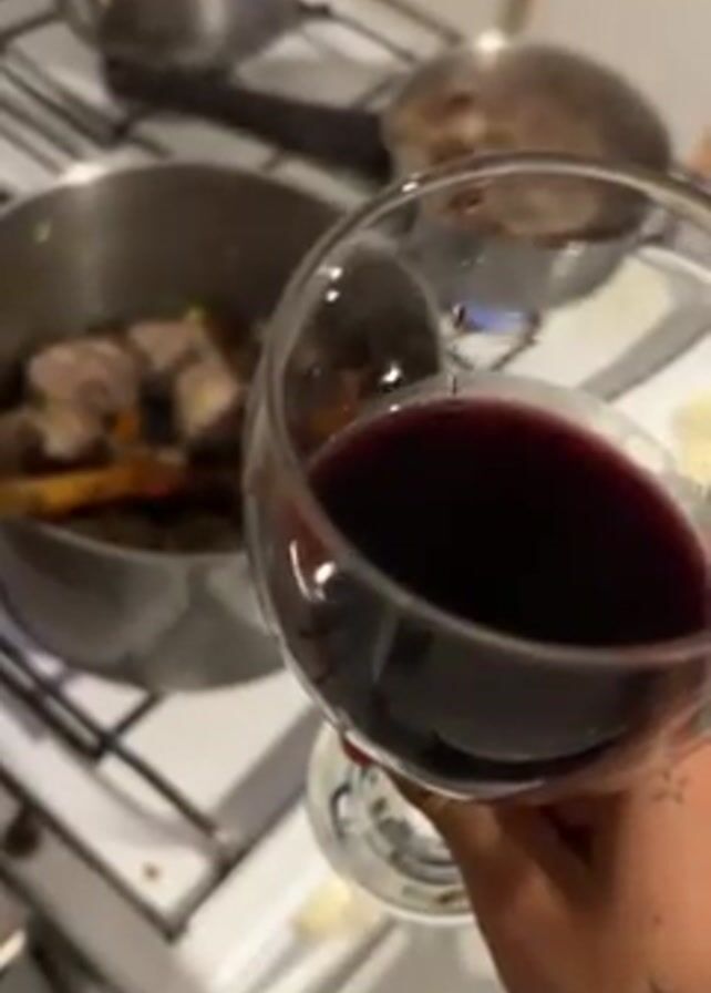 A hand holds a wine glass filled with red wine in front of a stove. On the stove, a pot with meat and vegetables is being stirred with a wooden spoon, while a pan on another burner shows some bubbling liquid. A silver kettle is also on the stove. The hand holding the wine glass has a tattoo on it.