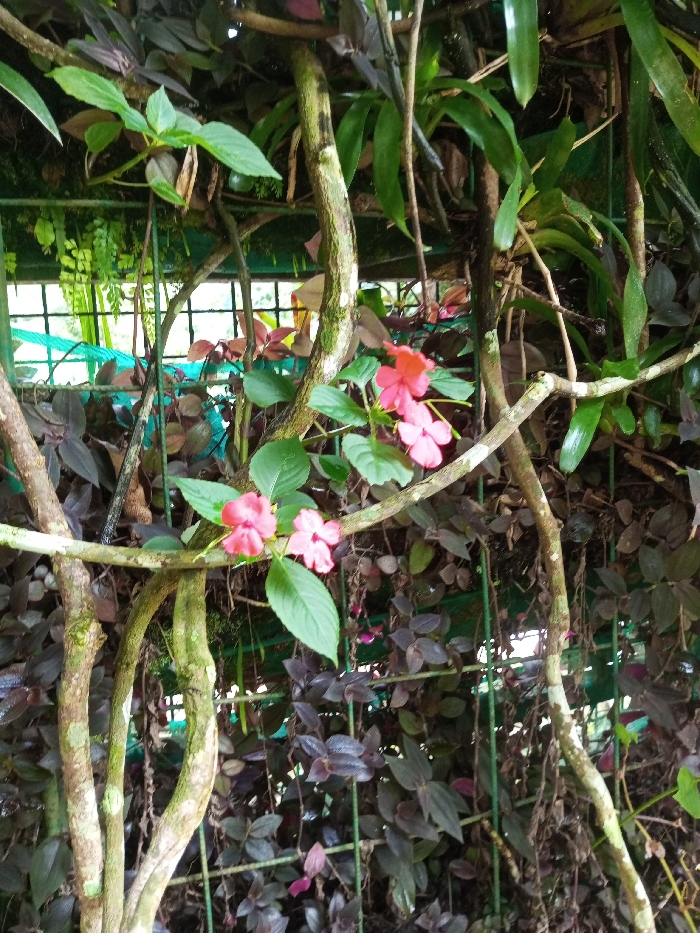 The scene depicts a densely vegetated area in Kanand, India. In the foreground, multiple thick, gnarled tree branches or vines, some displaying patches of light green moss, diagonally traverse the frame. Centrally, a plant features approximately five distinct pink flowers, each possessing five petals, surrounded by ovate green leaves. The background is composed of a dense layering of diverse foliage, including broad, vibrant green leaves and numerous smaller leaves exhibiting a dark purple or maroon coloration. A green metal grid fence or trellis is partially visible behind the plant growth, providing a support structure. No human subjects or discernible actions are present.