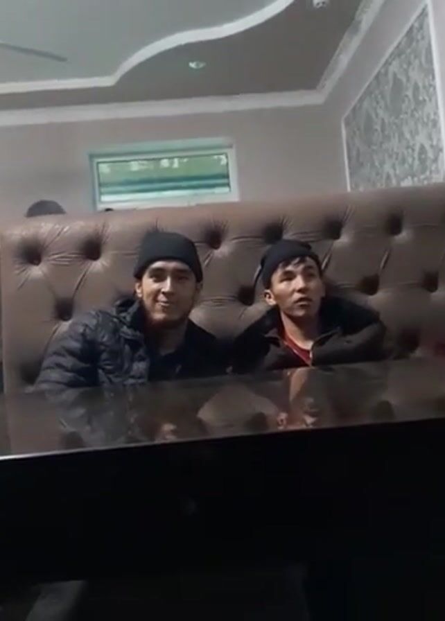 Two young men sit on a tufted, brown leather booth behind a glossy black table. Both wear black beanies and jackets. The man on the left wears a black quilted jacket and glances at the camera, holding up a finger briefly before looking down. The man on the right wears a dark jacket over a red shirt and looks around. The interior appears to be a restaurant, with a decorative wall, a window, and a ceiling fan visible in the background. Other people can be seen moving in the background.