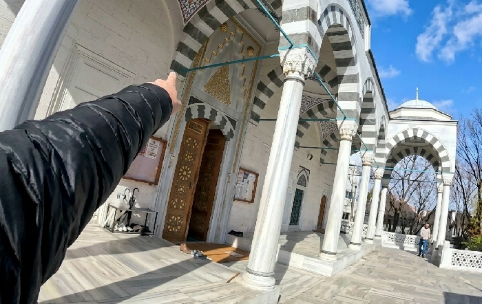 The image depicts the exterior of the Tokyo Camii & Turkish Culture Center, located in Shibuya, Japan, under a clear blue sky. The scene is captured from a low-angle, first-person perspective, with a person's right arm, covered by a black quilted jacket, extending from the lower left toward the center-right. The index finger of the hand is extended, pointing towards the ornate main entrance of the mosque. The mosque features prominent Ottoman-style architecture, characterized by a series of white marble columns supporting black and white striped arches. Green decorative sashes are draped between the arches and columns. The main entrance, centrally positioned, consists of an intricately carved wooden double door with gold-colored floral patterns, standing partially open. A pair of dark shoes is placed on a light-colored mat directly outside this entrance. To the left of the main door, an umbrella stand holds two black umbrellas, and multiple framed notices are affixed to the white wall. In the midground and background to the right, the columned portico continues, culminating in a section topped with a small, light-colored dome featuring a finial. Beyond the structure, in the far right background, a single male individual is visible walking on a paved pathway, wearing a light-colored top and dark pants. Bare trees are visible behind the mosque's arched sections. The ground surface is composed of light-colored, patterned marble tiles.