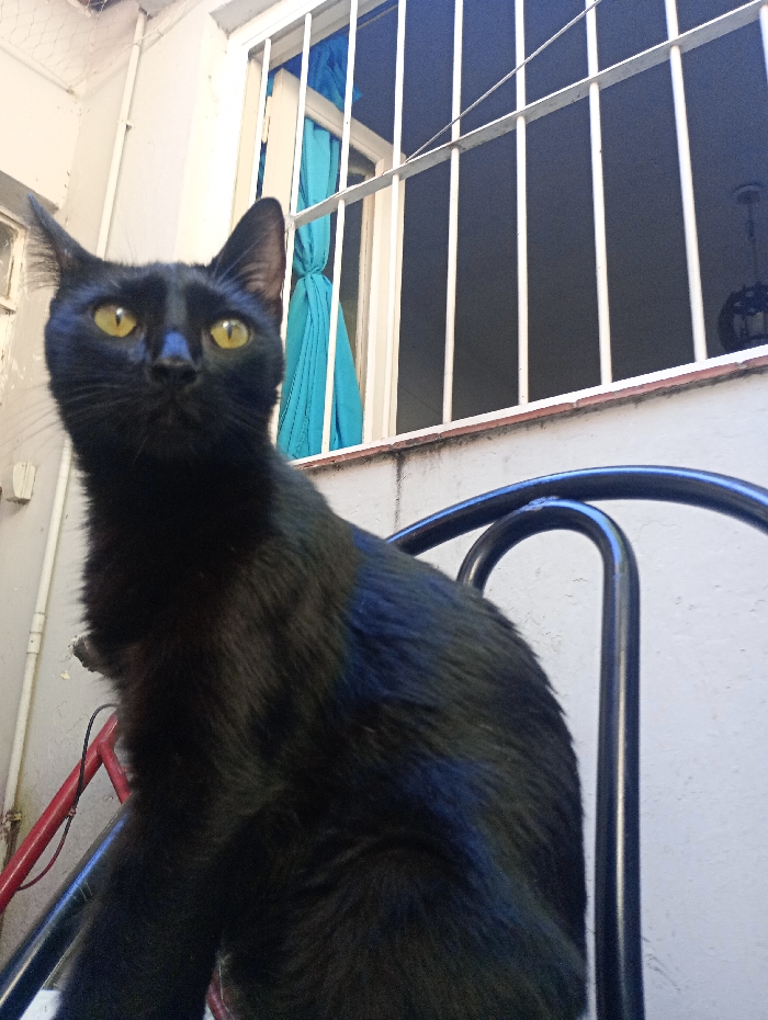 - "A sleek black cat with piercing yellow eyes sits perched on a black metal chair" by FM-kzA8r2, licensed under CC BY 4.0