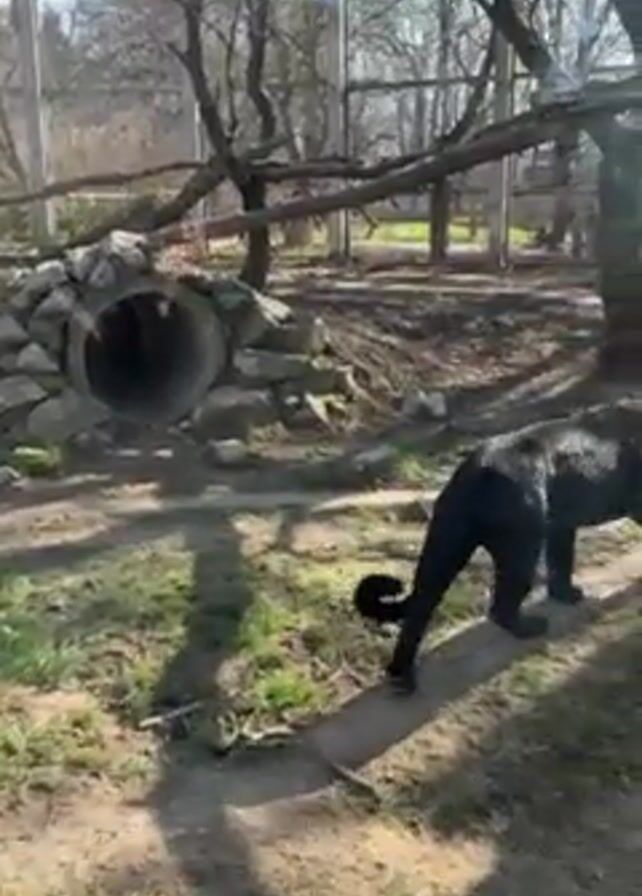 - "black panther walking around an enclosure with trees, a large concrete tube surrounded by rocks, and a dirt ground with patches of grass" by FM-z2Sa63, licensed under CC BY 4.0