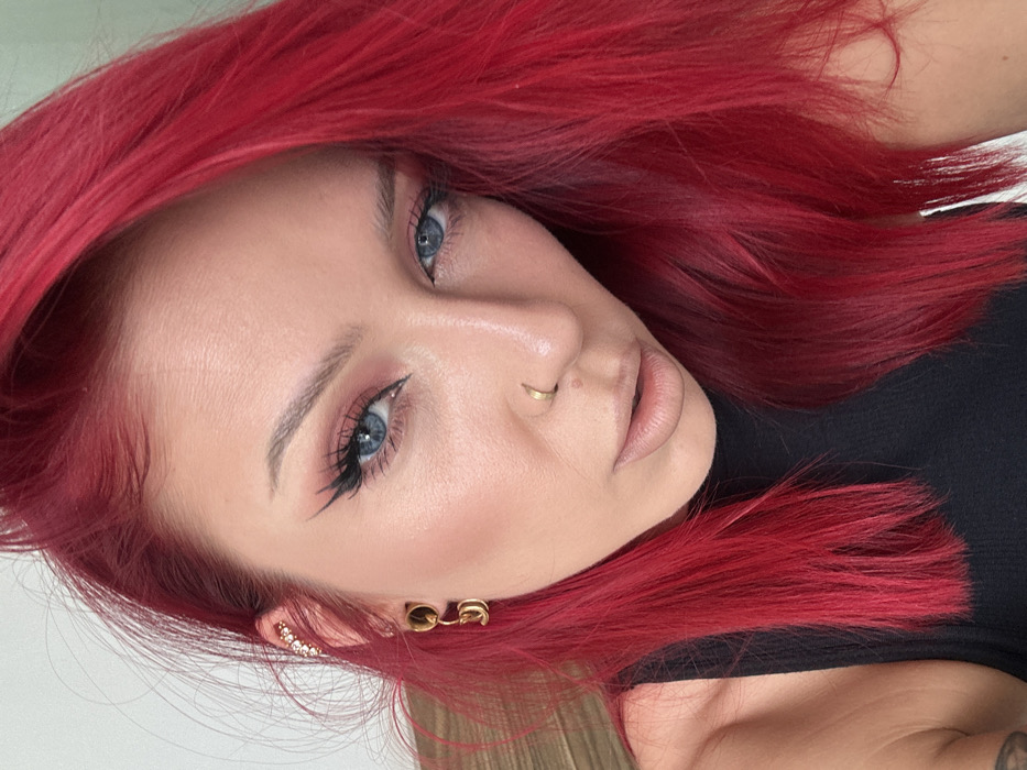 The image presents a close-up portrait of a female individual in South Jakarta, Indonesia. She has long, vibrant red hair and blue eyes, which are accentuated by black winged eyeliner and pink eyeshadow. Her complexion is fair, with blush visible on the cheeks. Her right nostril features a small gold-colored hoop piercing. The left ear displays a cartilage piercing with multiple clear, gem-like studs arranged in a curve, and a stretched earlobe fitted with two gold-colored, circular weights. Her lips are light-colored. She is wearing a black ribbed sleeveless top. The background is out of focus and light-toned, suggesting an indoor setting.