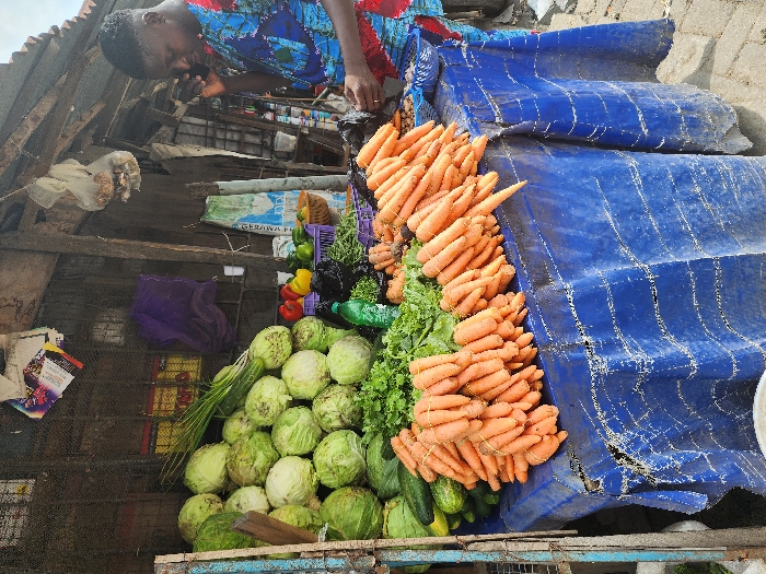 This image depicts an outdoor vegetable stall in an open-air market in Lagos, Nigeria