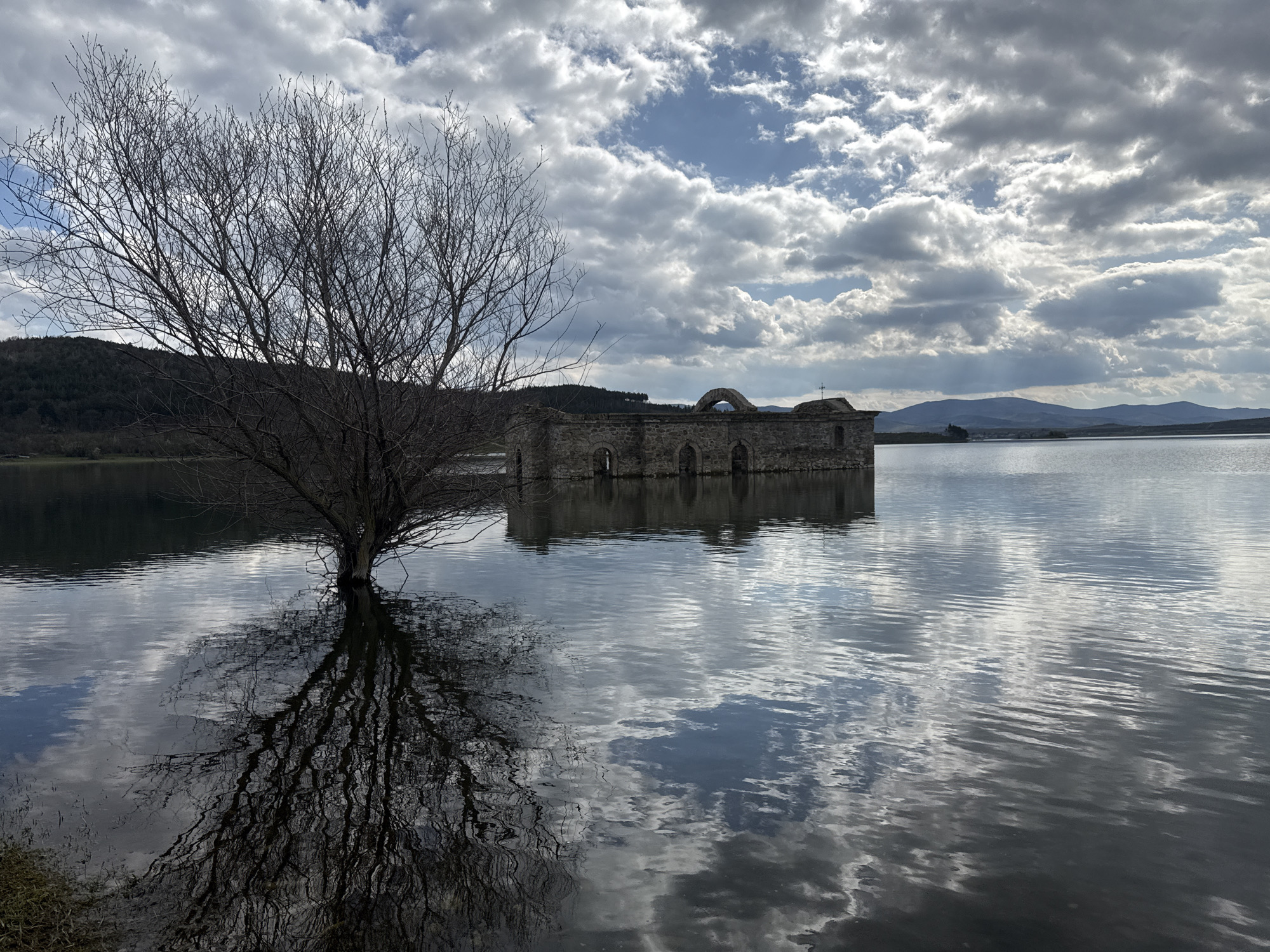 The image depicts the submerged ruins of the St. Ivan Rilski Church in the Zhrebchevo dam near the village of Panicherevo, Bulgaria. The church, a stone structure with arched windows and a partially collapsed roof, stands isolated in the water. A bare tree is present to the left, with its reflection visible in the water. The water reflects the cloudy sky above, and mountains are visible in the background. The landscape suggests a calm and overcast day.
