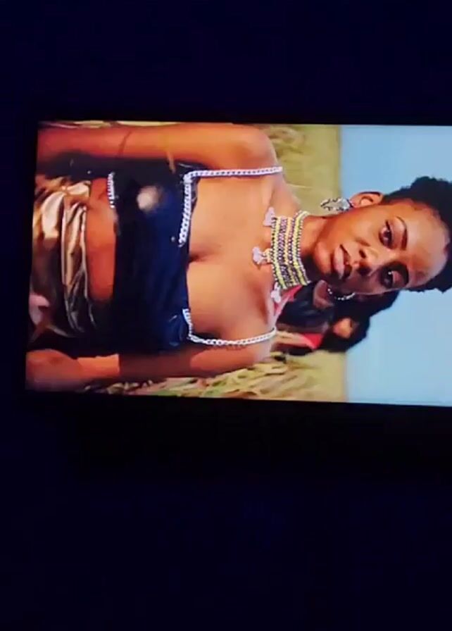 television screen displaying scenes from a music video. The first scene features a group of people standing on a sand dune near a blue tractor. The next two scenes show several African women with a man dressed in a denim jacket. In these scenes, they are standing in tall grass. The man makes hand gestures towards the camera.