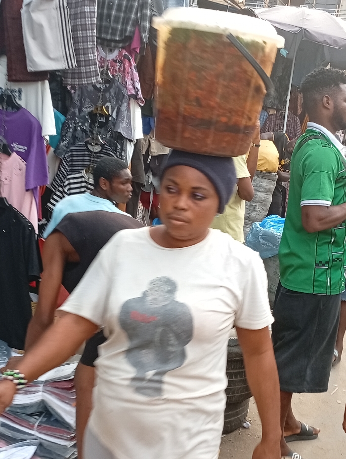 A woman in a white T-shirt with a gorilla graphic balances a large translucent bucket filled with liquid and solid contents on her head. She wears a dark cap. Behind her are stacks of clothing for sale, hung on racks. Several people are visible in the background. To her right is a man in a green shirt with black trim, while another person in a yellow shirt is partially obscured behind her. Tires are stacked on the ground to her left.