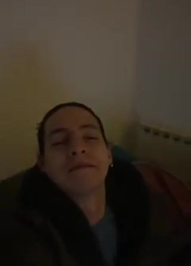 A person with long brown hair is lying down, looking at the camera. They are wearing a dark-colored jacket or robe. The room is dimly lit. The camera moves slightly, and the person's face is the primary focus. The background is a blurred wall and possibly a radiator.