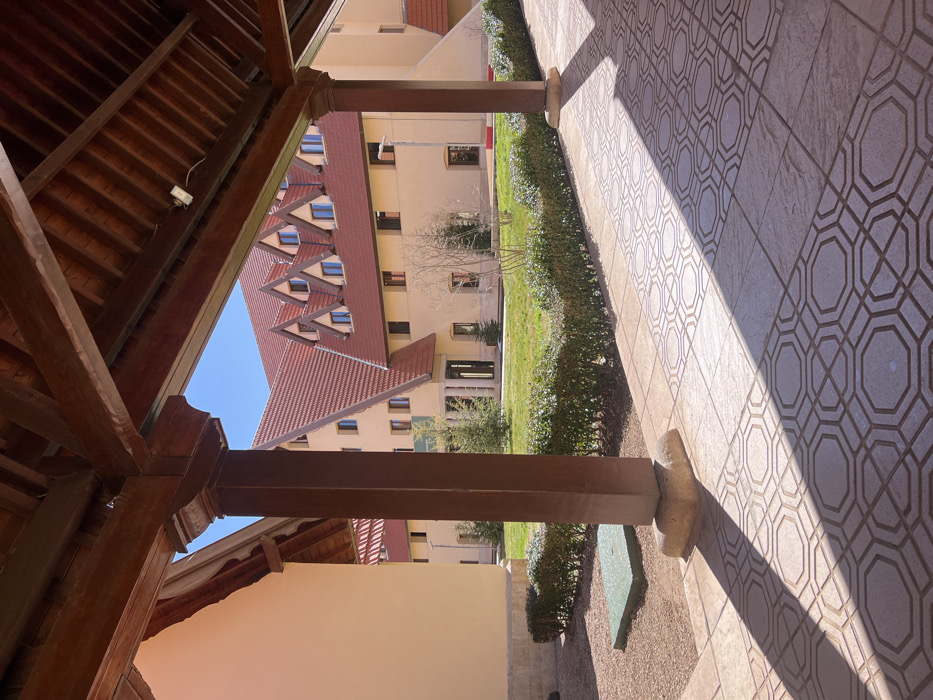 This image depicts an outdoor architectural scene at Al Akhawayn University in Ifrane, Morocco, under a clear blue sky and direct sunlight. The foreground features a covered walkway with a dark brown wooden beam ceiling and prominent dark brown wooden support pillars. The walkway's floor is paved with light-colored tiles exhibiting a repeating octagonal geometric pattern, across which strong angular shadows are cast from the overhead structure. To the left of the central pillar, a patch of gravel contains a flat, square, dark green access cover. The walkway borders a manicured grassy area, delineated by a low, trimmed green hedge. This green space contains several sparse young trees. In the midground and background, a substantial multi-story building with light cream-colored walls is visible. This building features a distinctive, steeply pitched roof covered in red tiles, punctuated by multiple symmetrical dormer windows, each containing a window. Numerous dark-framed rectangular windows are visible across its facade, along with a central entrance featuring dark-framed doors. A light pole stands to the right of the building's exterior. No individuals are present in the scene.