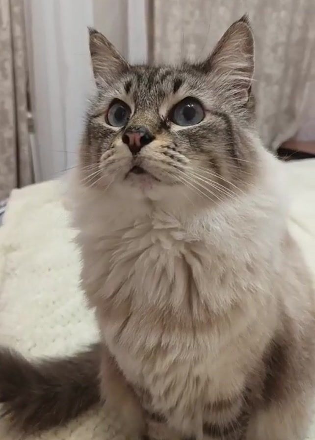 fluffy tabby cat with striking blue eyes sitting on a beige textured blanket. The cat is looking upward, appearing curious. The background includes a curtain. The cat makes a meowing sound.