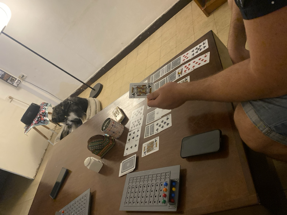 - "An indoor scene in Tel Aviv, Israel, depicts a person playing a card game on a dark wooden table" by FM-jWoq23, licensed under CC BY 4.0