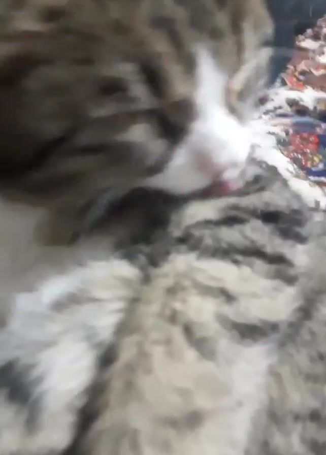close-up of a cat grooming itself. The cat has tabby markings with white fur on its chest and nose. It is lying on a surface with a patterned fabric. The cat is licking its chest fur, and the camera's focus shifts slightly during the recording.