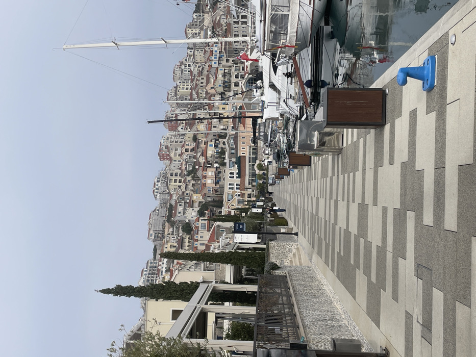 This image depicts a marina promenade in Radovići, Montenegro, under an overcast sky. A wide pedestrian walkway, paved with alternating light and dark grey rectangular tiles, extends from the foreground into the distance, running parallel to the water on the right. On the right side of the promenade, numerous white yachts and motorboats are moored in calm water, with masts and rigging visible, particularly a tall white mast in the mid-right. A British Red Ensign flag is visible on the stern of one boat. Utility pedestals and wooden-faced bollards line the waterside edge of the promenade. In the immediate foreground, on the right, a bright blue plastic cleat is affixed to the promenade edge. On the left side of the promenade, a low stone wall topped with a black metal fence separates the walkway from multi-story buildings. These structures have light-colored facades, some with covered outdoor areas, and are interspersed with tall, slender cypress trees. Further down the promenade, several individuals are visible walking. The background features a steep hillside densely covered with numerous multi-story residential buildings characterized by light-colored walls and terracotta-tiled roofs, displaying a Mediterranean architectural style. Sparse vegetation is visible between the buildings on the hillside.