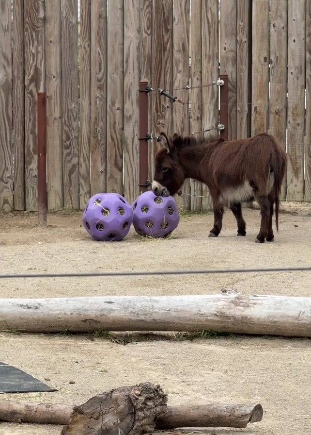 A brown donkey is standing in a sandy enclosure. The donkey appears to be interacting with two large, purple, spherical toys with holes in them. Behind the donkey is a tall wooden fence. Two logs are on the ground in the foreground, and part of a rubber mat is visible on the ground to the left. In the background, children are speaking.