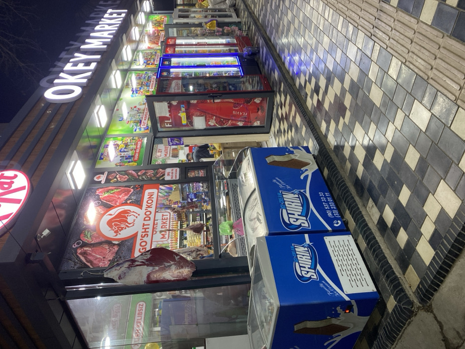 An angled view reveals an "OKEY MARKET" storefront, showcasing various food items through its windows. There are visible meat products, candies, and beverages. A "Kit Kat" advertisement is prominent on the left. Below, freezers labeled "SHIRIN" display ice cream. The sidewalk is tiled in a black and white checkered pattern. Several refrigerators line the storefront. Signs read "GO'SHT DO'KONI OKEY MARKET" and display phone numbers.