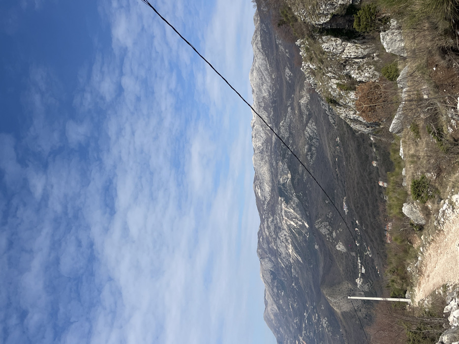 The image depicts a panoramic mountainous landscape observed from an elevated vantage point in Čelobrdo, Montenegro, under a bright blue sky with scattered white cumulus clouds. In the immediate foreground, a light-brown dirt path extends from the lower left corner, curving gently uphill to the right. The ground is rocky, with scattered light-colored boulders and sparse, dry vegetation consisting of bushes and small, leafless trees. A white utility pole, featuring a crossbar, is positioned on the left side of the path. A single black cable stretches diagonally across the entire frame, from the top right to the mid-left, appearing connected to the aforementioned utility pole. The midground reveals a deep valley densely covered in dark-colored vegetation, presumably trees, interspersed with prominent white rocky outcrops. Several scattered residential buildings with light-colored roofs are visible within the vegetated slopes. The background features a large mountain range with extensive areas of exposed grey rock, characteristic of karst topography, and distinct patches of white, indicating snow or frost, particularly on higher elevations. No individuals are present in the scene.